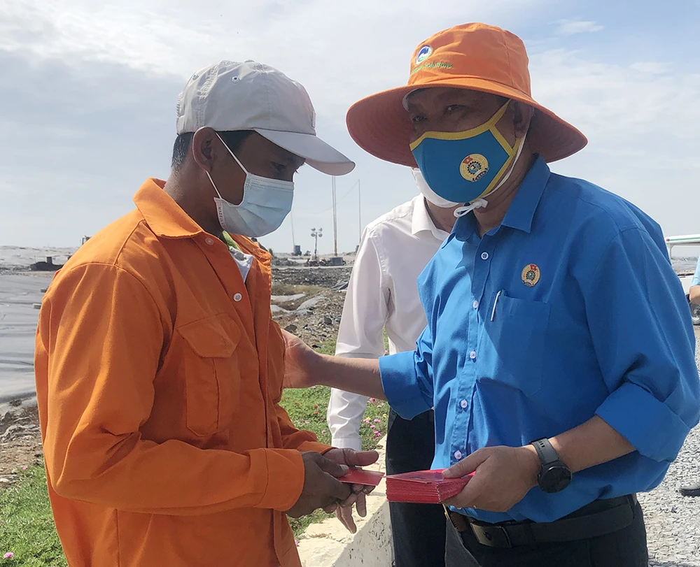 Ông Trần Đoàn Trung, Phó Chủ tịch thường trực Liên đoàn Lao động TP.HCM “lì xì muộn” và tặng quà cho người lao động.