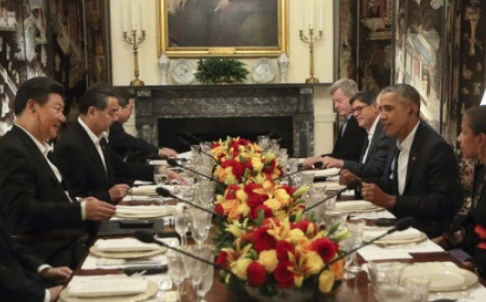 Chủ tịch Trung Quốc Tập Cận Bình ngồi đối diện Tổng thống Mỹ Barack Obama trong bữa tối làm việc riêng của họ ở Washington vào đêm 24-9.