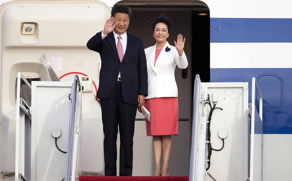 Chủ tịch Trung Quốc Tập Cận Bình cùng phu nhân Bành Lệ Viện tại căn cứ không quân Andrews ở Maryland hôm 24-9.