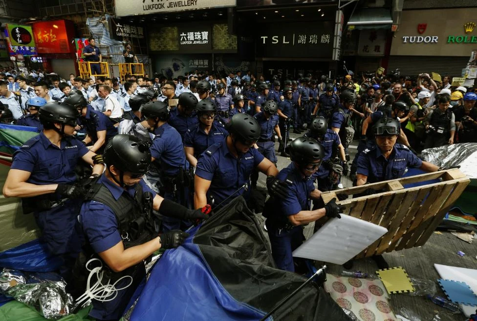 Họ vấp phải sự phản ứng dữ dội bởi hàng trăm người biểu tình vung biểu ngữ màu vàng và đòi dân chủ. Một viên cảnh sát hô lớn: “Ai chống cự sẽ bị bắt giam. Chúng tôi cảnh báo mọi người ngay lập tức ngừng kháng cự”.