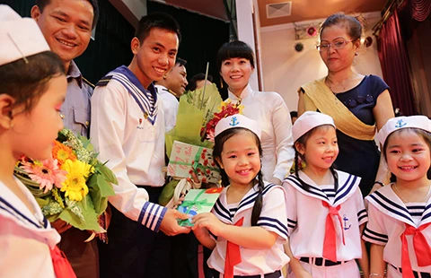 Các em thiếu nhi quận 4 tặng quà các chiến sĩ tại buổi giao lưu. Ảnh: NGUYỄN HOÀNG