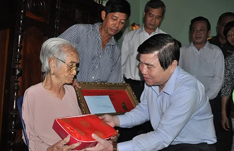 Ông Nguyễn Thành Phong, Chủ tịch UBND TP.HCM, tặng lụa và khánh mừng thọ cho cụ Thái Thị Giỏi, 100 tuổi, tại ấp An Lộc, xã Tam Thôn Hiệp, Cần Giờ. Ảnh: TÁ LÂM