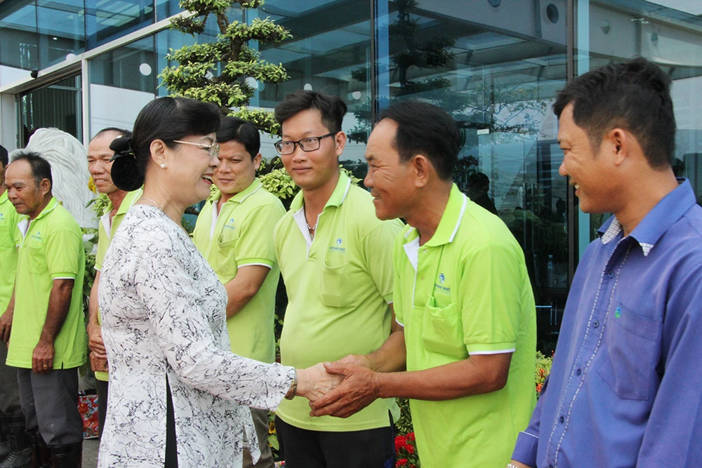 Bà Nguyễn Thị Quyết Tâm (nguyên Chủ tịch HĐND TP.HCM) bắt tay thăm hỏi người lao động