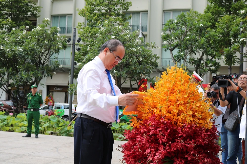 Đoàn dâng hoa gồm có ông Nguyễn Thiện Nhân - Bí thư Thành ủy TP.HCM; bà Võ Thị Dung - Phó Bí thư Thành ủy TP.HCM; bà Tô Thị Bích Châu - Chủ tịch Ủy ban Mặt trận Tổ quốc Việt Nam TP.HCM; ông Lê Thanh Liêm - Phó Chủ tịch UBND TP.HCM cùng nhiều cán bộ là tấm gương điển hình ở các đơn vị sự nghiệp của thành phố vào sáng nay (9-6).