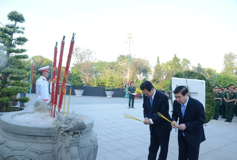 Nguyên Thủ tướng Nguyễn Tấn Dũng và Chủ tịch UBND TP.HCM Nguyễn Thành Phong thắp hương tri ân các anh hùng liệt sĩ. Ảnh: PHƯƠNG THÙY
