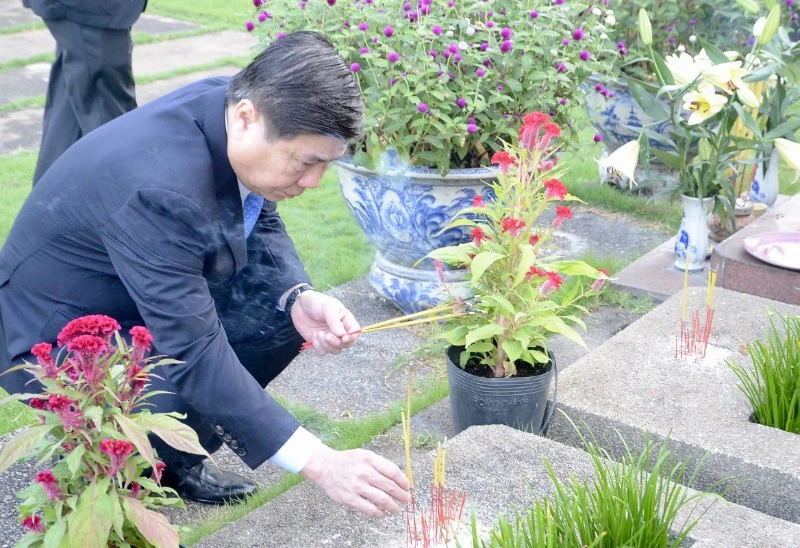 Chủ tịch UBND TP.HCM Nguyễn Thành Phong thắp hương một mộ liệt sĩ. Ảnh: PHƯƠNG THÙY