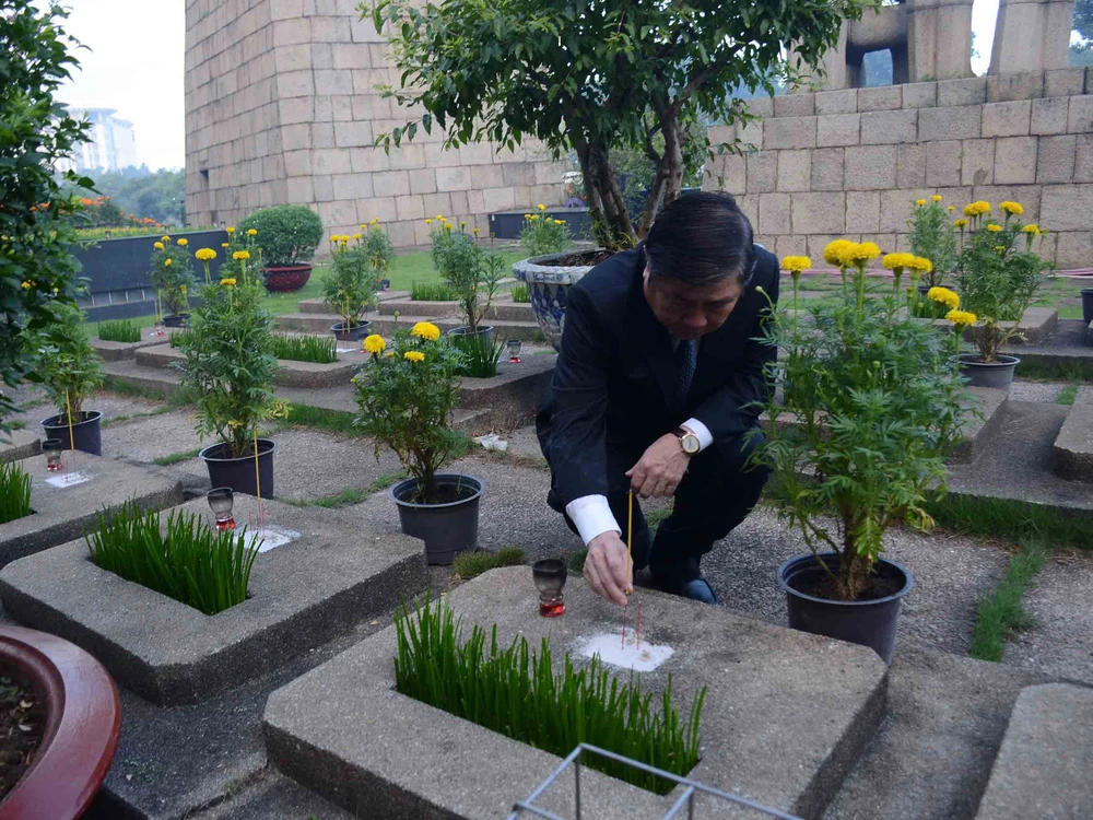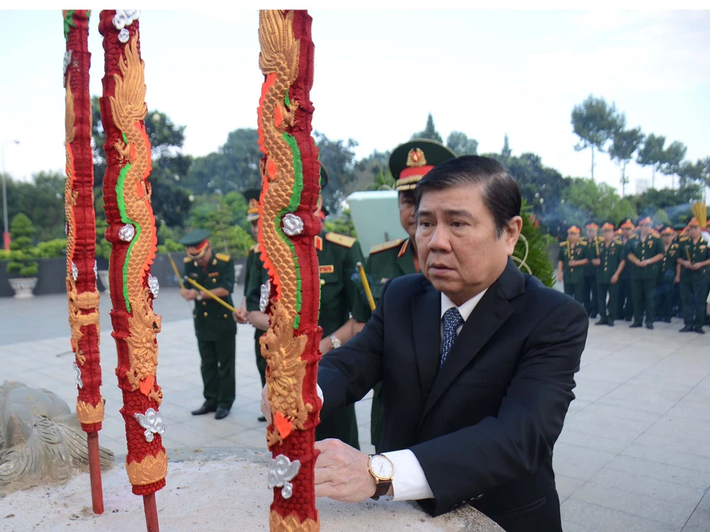 Chủ tịch UBND TP Nguyễn Thành Phong dâng hương tưởng nhớ các Anh hùng Liệt sĩ. Ảnh: PHƯƠNG THÙY