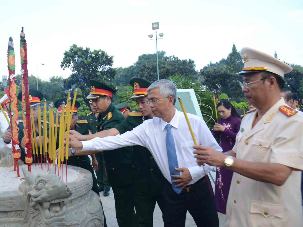 Phó Chủ tịch UBND TP Võ Văn Hoan cùng các lãnh đạo thắp hương tưởng nhớ các anh hùng liệt sĩ. Ảnh: PHƯƠNG THÙY
