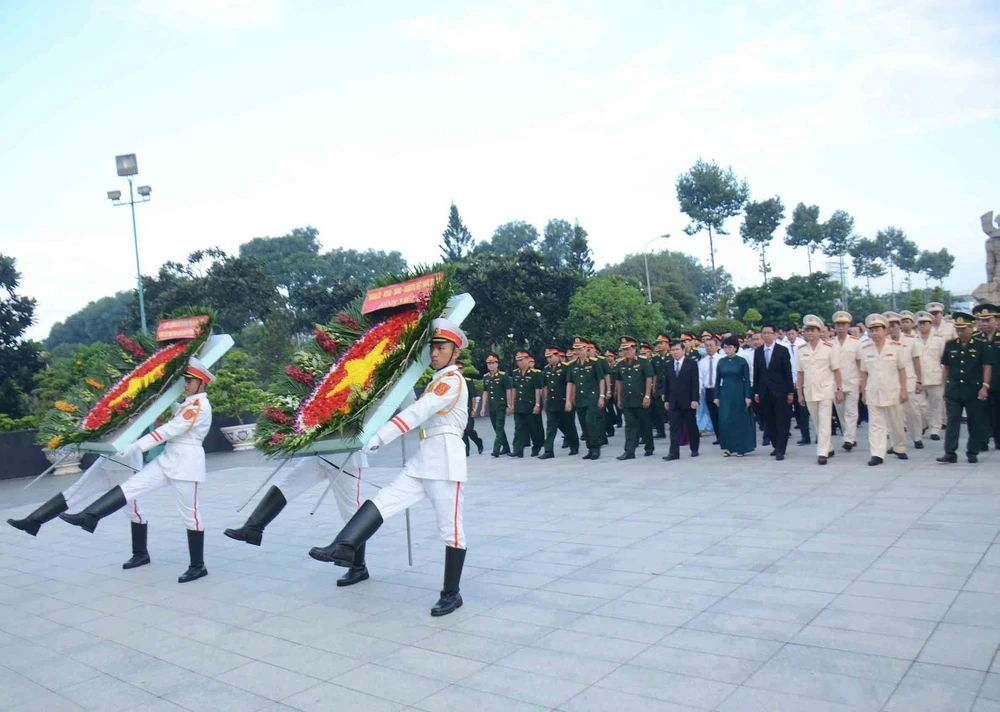 Đoàn lãnh đạo TP.HCM thực hiện nghi thức dâng hoa tưởng niệm các anh hùng liệt sĩ. Ảnh: PHƯƠNG THÙY