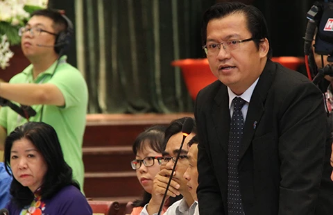 Thanh niên đang đặt ra các vấn đề "nóng" với lãnh đạo TP.HCM tại buổi đối thoại , ngày 20-3. Ảnh: TÁ LÂM