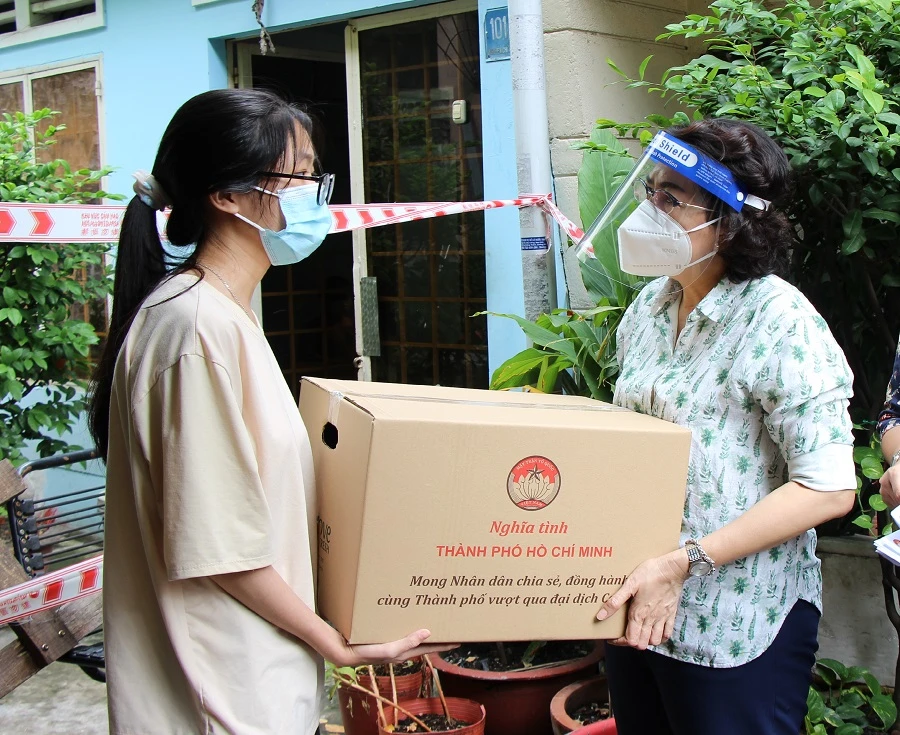Chủ tịch Ủy ban MTTQ TP.HCM Tô Thị Bích Châu đã ân cần thăm hỏi sức khỏe, sinh hoạt hàng ngày của các hộ dân trong thời gian thực hiện giãn cách xã hội.