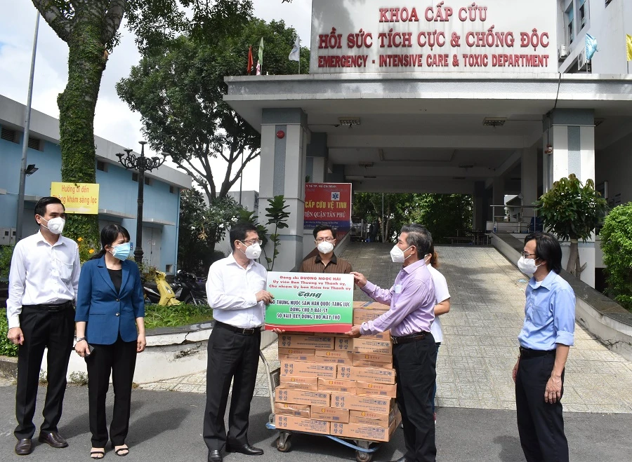 Ông Dương Ngọc Hải tặng quà cho đội ngũ y, bác sĩ đang làm nhiệm vụ tại Bệnh viện quận Tân Phú. Ảnh: PHƯƠNG THÙY