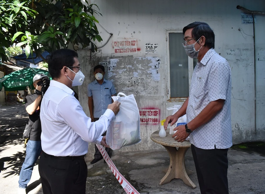 Phó Bí thư Thành ủy TP.HCM Nguyễn Hồ Hải thăm hỏi, động viên và trao quà cho người dân. Ảnh: Web Thành ủy TP.HCM