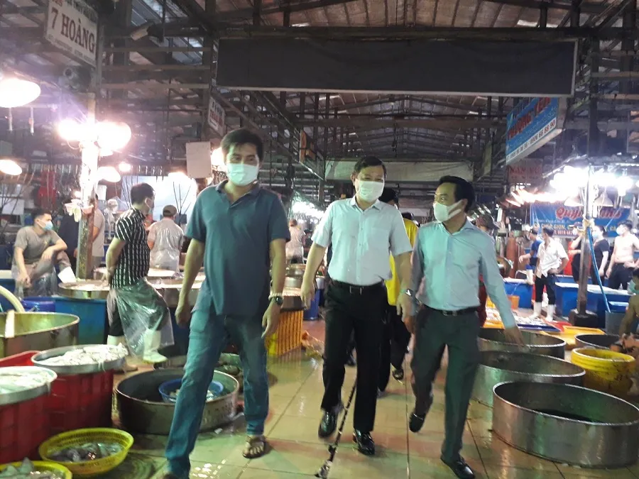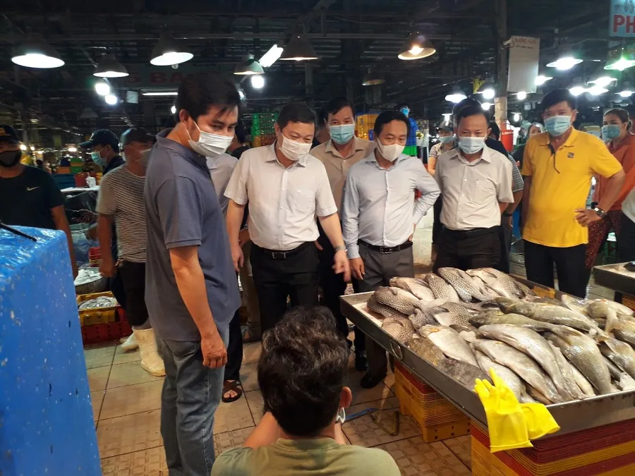 Phó Chủ tịch UBND TP.HCM Dương Anh Đức (ở giữa) kiểm tra khu vực chợ hải sản. Ảnh: TÁ LÂM