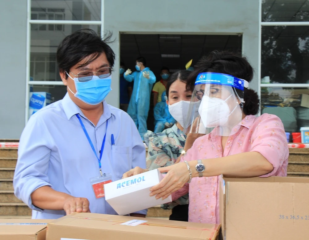 Ông cũng thay mặt Ban Chỉ đạo phòng, chống dịch COVID-19 TP.HCM gửi đến phần quà gồm dầu gió, nước muối sinh lý, kẹo ngậm, vitamin C sủi... một tờ báo cho người dân ở khu cách ly, các bệnh viện điều trị COVID-19.