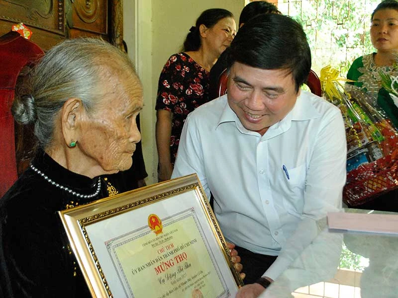 Chủ tịch UBND TP.HCM Nguyễn Thành Phong đã ân cần thăm hỏi mẹ Việt Nam anh hùng Đặng Thị Thu. Ảnh: T.LÂM