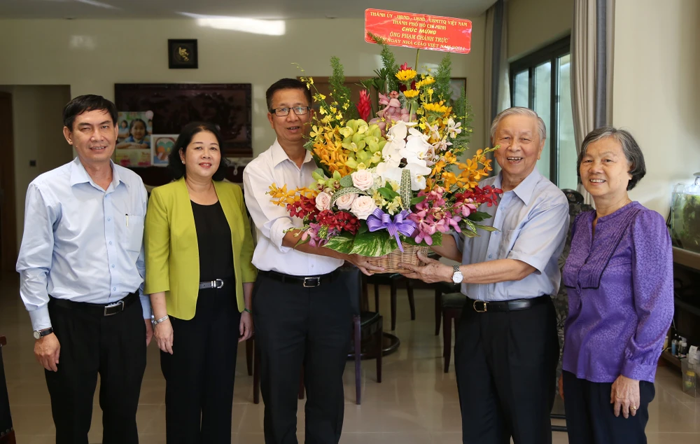 Đoàn lãnh đạo TP.HCM tặng hoa chúc mừng ông Phạm Chánh Trực nhân ngày Nhà giáo.