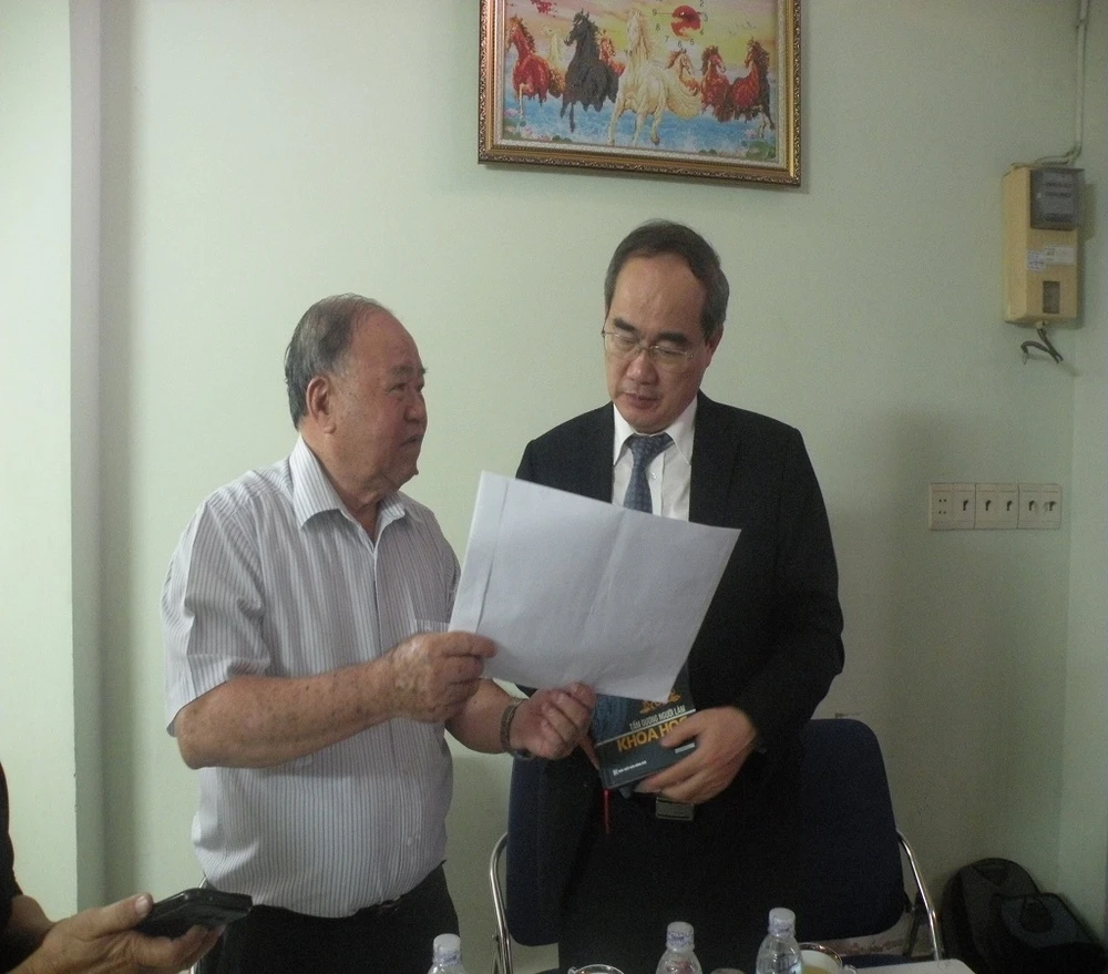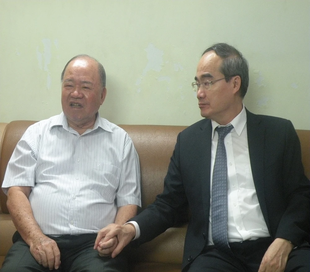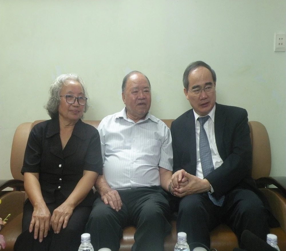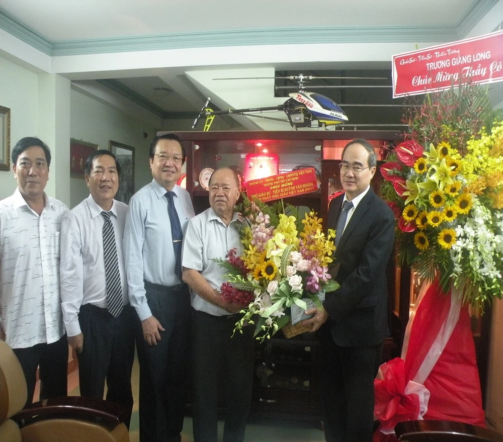 Thay mặt lãnh đạo TP, ông Nguyễn Thiện Nhân gửi lời chúc sức khỏe đến gia đình thầy Hoàng và đánh giá cao những đóng góp của thầy đối với sự phát triển của nền giáo dục TP.HCM.
