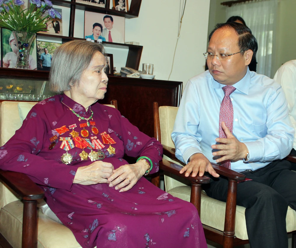 Phó Bí thư Thường trực Thành ủy TP.HCM Tất Thành Cang thăm hỏi phu nhân Tổng Bí thư Lê Duẩn. Ảnh: TÁ LÂM