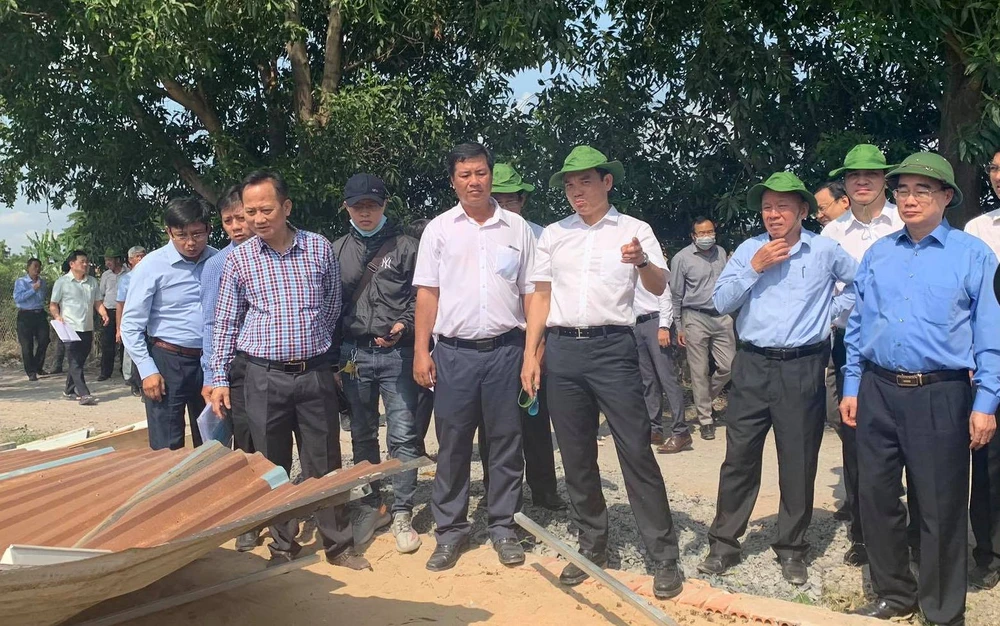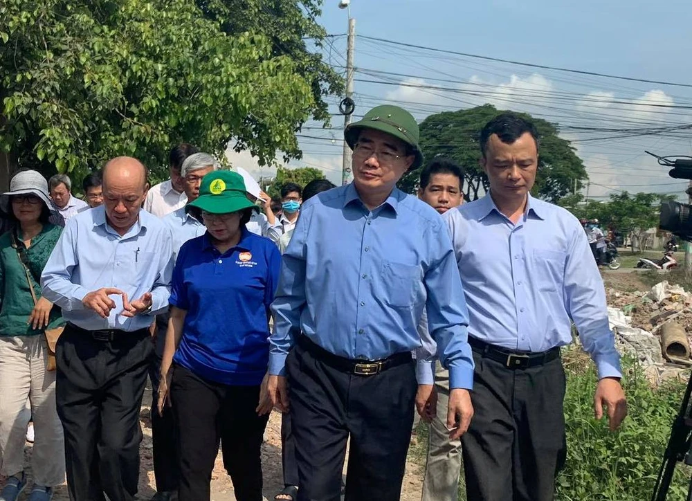 Bí thư Thành ủy TP.HCM Nguyễn Thiện Nhân, Phó Bí thư Thường trực Thành ủy Trần Lưu Quang, Phó Chủ tịch UBND TP Võ Văn Hoan cùng lãnh đạo nhiều cơ quan, đơn vị đi thị sát tình trạng nhà xây không phép ở huyện Bình Chánh. Ảnh: VIỆT HOA