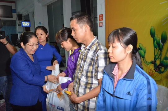 Bà Võ Thị Dung, Phó Bí thư Thành ủy TP.HCM thăm hỏi và trao quà tết cho công nhân trước khi lên tàu về ăn tết cùng gia đình. Ảnh: HĐ