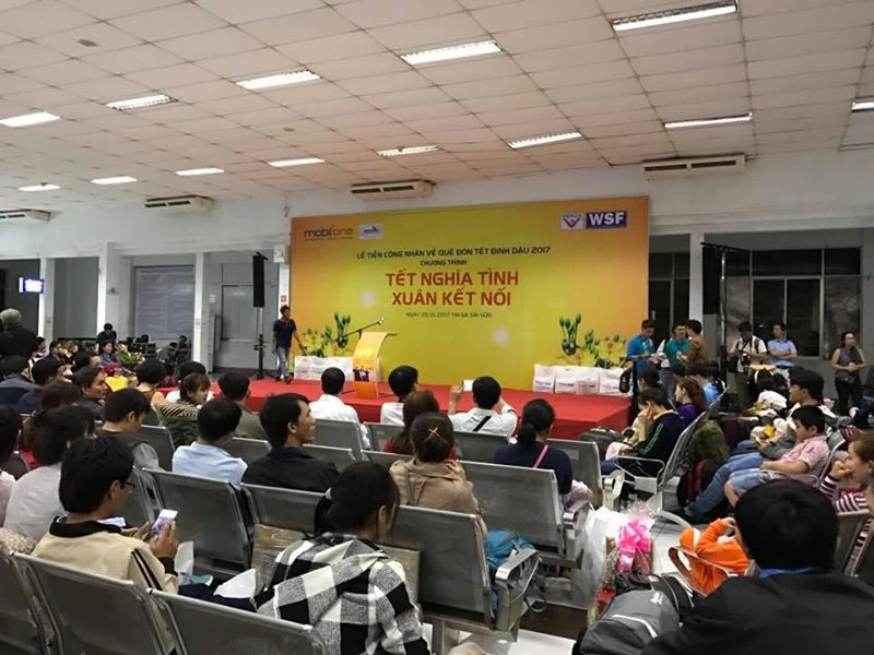 Tối 25-1, tại Ga Sài Gòn, Chương trình “Tết nghĩa tình, Xuân kết nối” do Quỹ hỗ trợ Công nhân TP.HCM cùng Công ty Cổ phần Vận tải đường sắt Hà Nội đã tiễn 550 công nhân về ăn tết cùng gia đình trong dịp Tết Nguyên đán Đinh Dậu 2017.