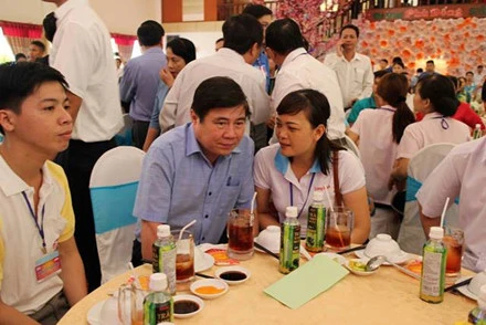 Chủ tịch UBND TP.HCM Nguyễn Thành Phong dùng cơm thân mật với công nhân tham dự ngày hội. Ảnh: L.TUYẾT