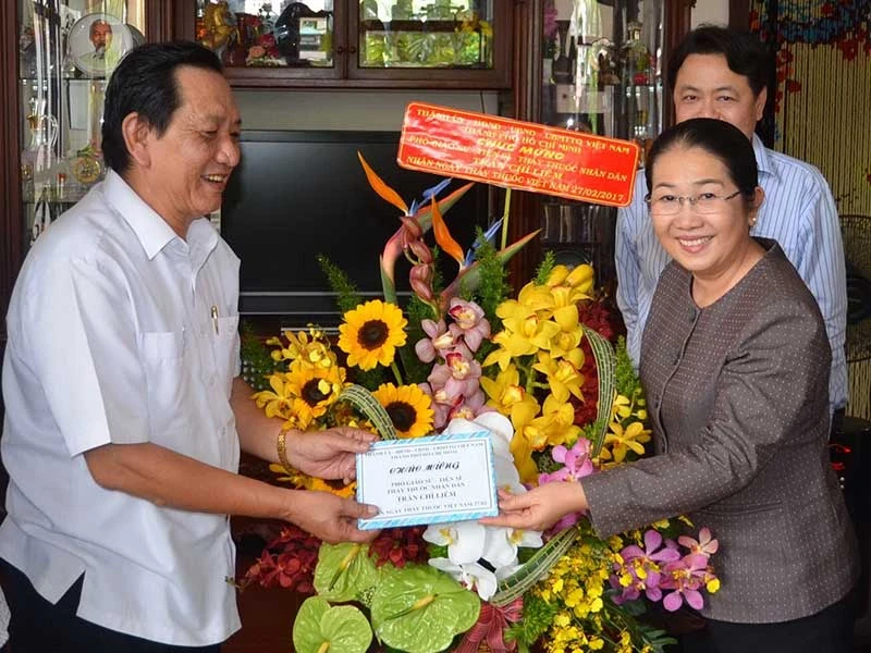 Phó Bí thư Thành ủy Võ Thị Dung tặng hoa chúc mừng PGS-TS, Thầy thuốc nhân dân Trần Chí Liêm. Ảnh: TL