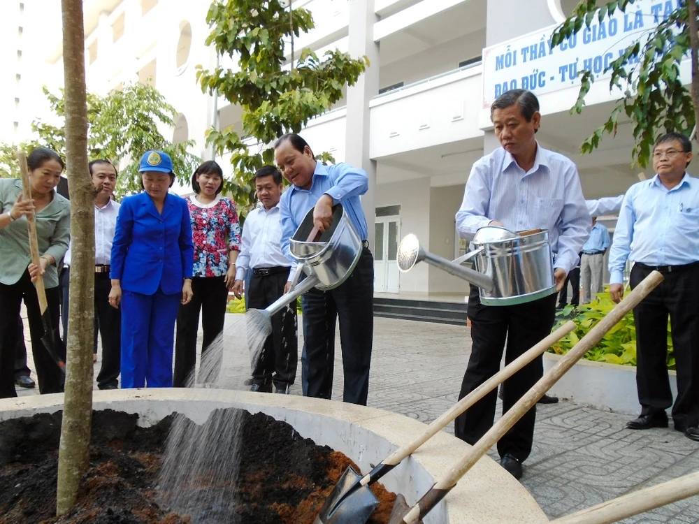 Bí thư Thành ủy TP.HCM Lê Thanh Hải, Phó Chủ tịch TP.HCM Hứa Ngọc Thuận cùng các lãnh đạo thành phố trồng cây xanh tại khuôn viên trường THCS Lý Thánh Tông