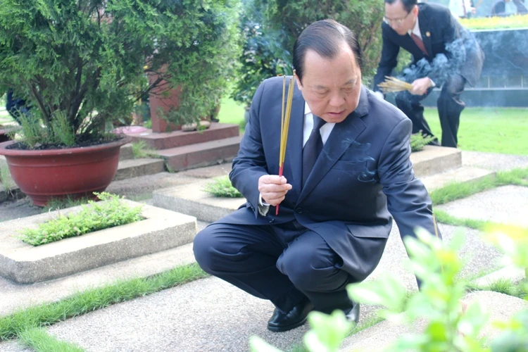 Sau đó, đoàn tiếp tục đến dâng hương tại Nghĩa trang TP (Lạc Cảnh). PLO gửi đến bạn đọc những hình ảnh đầy xúc động tại Nghĩa trang liệt sĩ TP sáng nay.