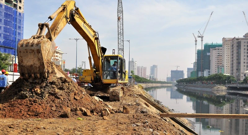 Các công nhân vẫn miệt mài thi công dự án xây cầu kết nối giữa cầu Nguyễn Văn Cừ với đường Võ Văn Kiệt (quận 1, quận 5). Ảnh: MP