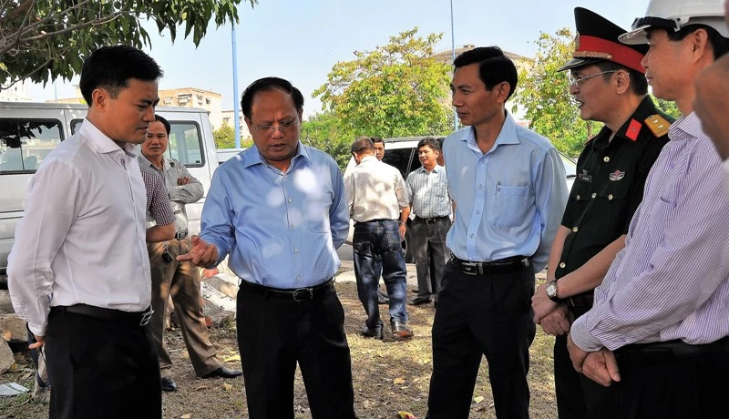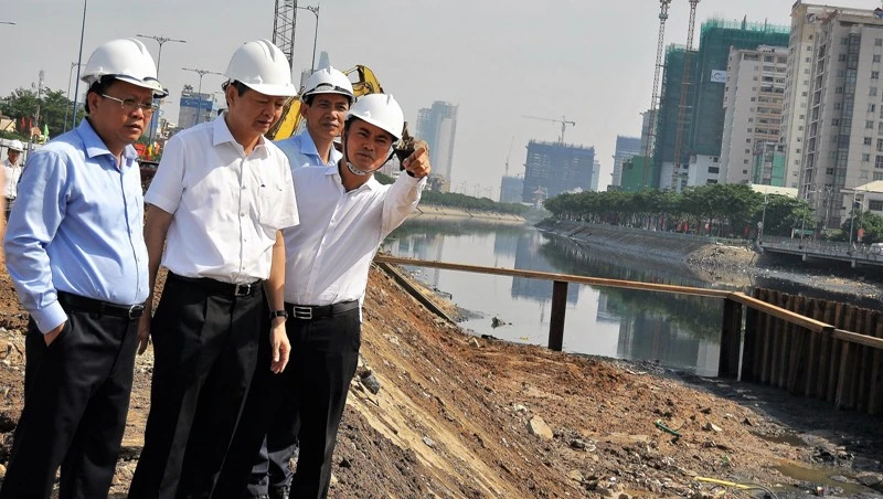 Giám đốc Sở GTVT Bùi Xuân Cường giới thiệu với lãnh đạo TP.HCM về dự án xây cầu kết nối cầu Nguyễn Văn Cừ với đường Võ Văn Kiệt. Ảnh: MP