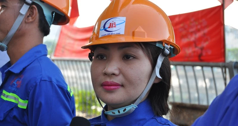 Nữ công nhân Đặng Thị Loan là “bóng hồng” duy nhất ở công trình cầu kết nối giữa cầu Nguyễn Tri Phương và đường Võ Văn Kiệt (quận 5, quận 8) vẫn tham gia làm việc xuyên Tết. Ảnh: MP