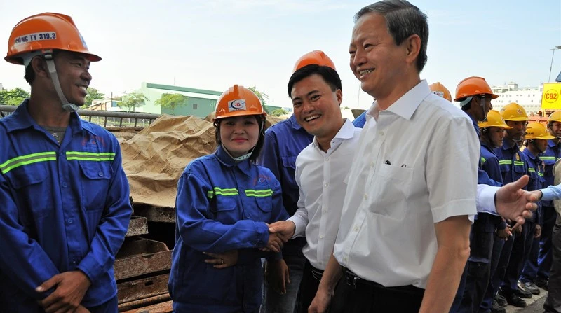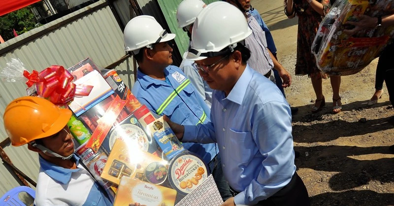 Khi đoàn lãnh đạo TP.HCM đến công trình cầu kết nối giữa cầu Nguyễn Văn Cừ và đường Võ Văn Kiệt, một số công nhân đang dở việc vẫn tiếp tục thi công. Vì vậy, Phó Bí thư Thường trực TP.HCM Tất Thành Cang đã đến tận nơi thăm hỏi, động viên và lì xì lấy hên đầu năm cho họ. Ảnh: MP