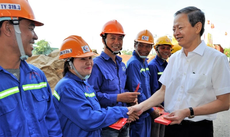 Phó Bí thư Thường trực TP.HCM Tất Thành Cang lì xì cho một công nhân lớn tuổi nhất ở công trình cầu kết nối giữa cầu Nguyễn Văn Cừ và đường Võ Văn Kiệt. Người công nhân này đã hơn 60 tuổi và cũng là đồng hương với Phó Bí thư Tất Thành Cang, ở huyện Cần Giuộc, Long An. Ảnh: MP