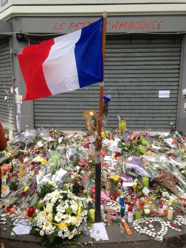Người dân đặt nến, hoa, treo cờ Pháp rủ tưởng niệm nạn nhân khủng bố. Ảnh: Twitter