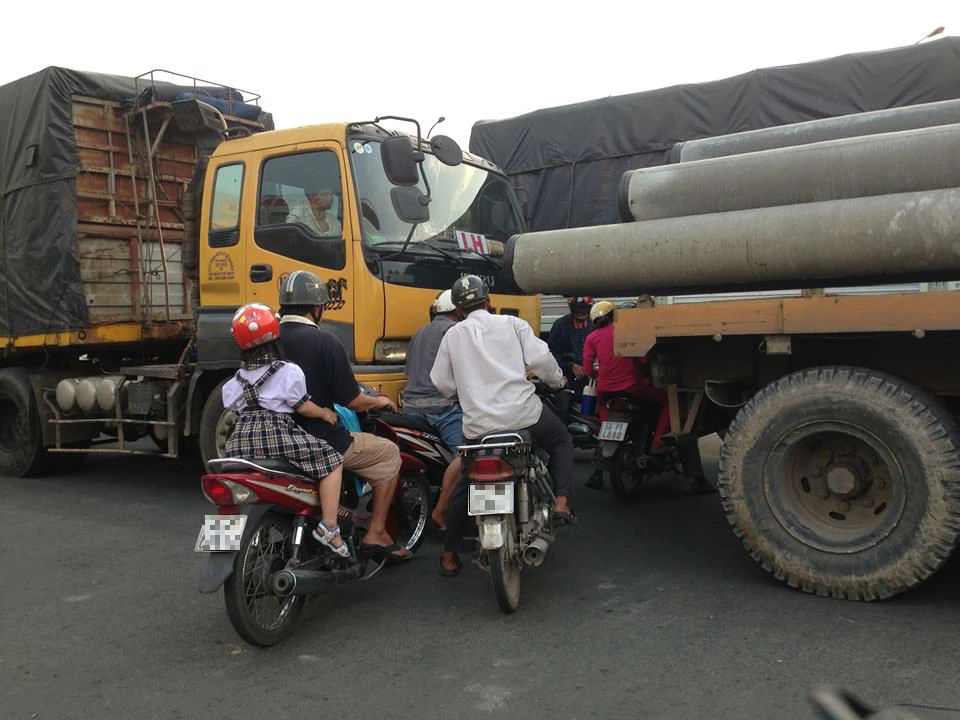 Nhiều người sốt ruột, không thể đợi nên đã liều mạng luồn lách dưới những trụ bê tông của xe kéo, men theo khoảng trống giữa hai xe tải để đi ngoằn nghèo để băng qua đường. Trong khi đó, các bác tài xe tải liên tục xả hơi, đá thắng, âm thanh nghe chói tai nhằm "hù" không cho xe máy chen lấn nhưng, bất chấp hiểm nguy, người đi xe máy cứ liều mình lạng lách để băng qua, có không ít phụ huynh chở con em đi học về cũng bám theo, tật nguy hiểm.