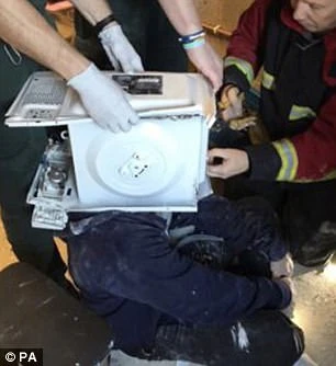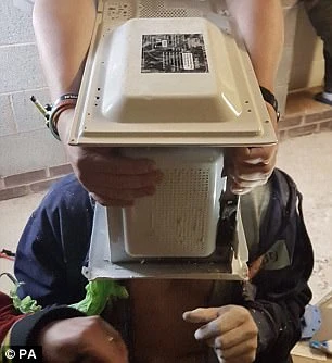 Theo Daily Mail cho biết năm người lính cứu hỏa phải mất một giờ đồng hồ mới giải cứu được anh chàng khốn khổ ra khỏi chiếc lò vi sóng.
