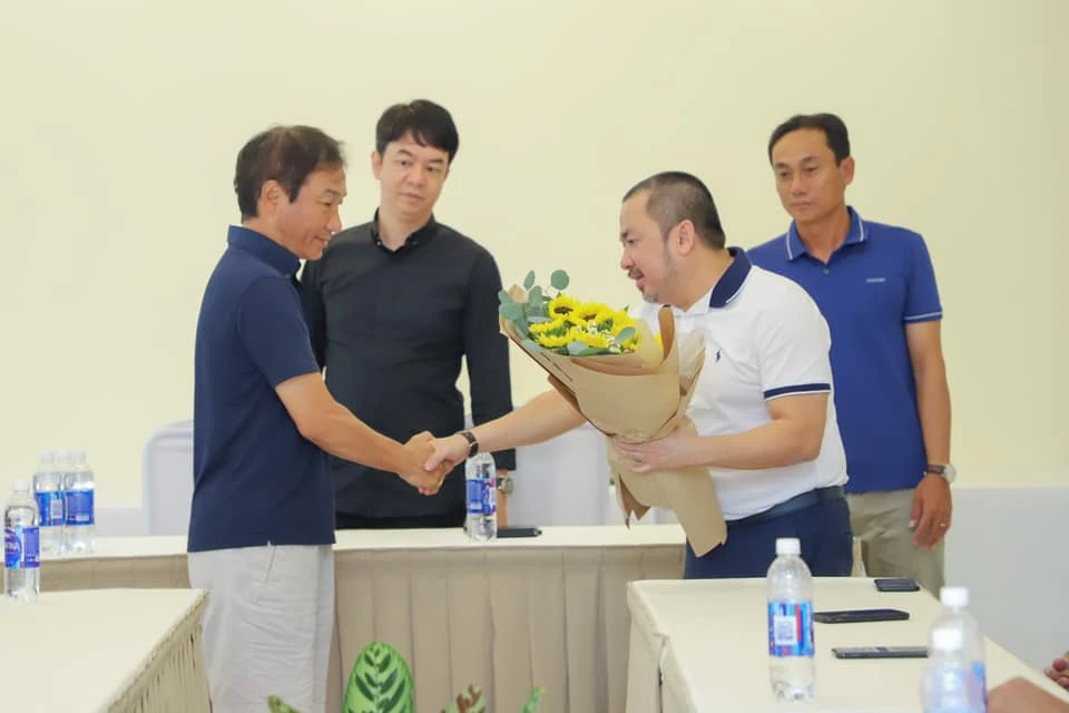 Bầu Bình bắt tay chia sẻ với ông Shimoda ngay từ sáng 30-3 đã không còn làm HLV của đội Sài Gòn nữa. Ảnh: ANH HOÀNG.