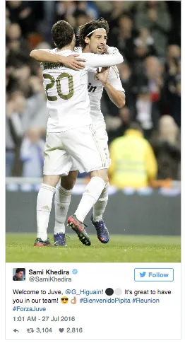 Gia nhập đoàn quân áo sọc đứng, Higuain có dịp gặp lại người đồng đội mới của mình, Sami Khedira, một gương mặt quen thuộc đã từng đánh bại Gonzalo trên bình diện quốc gia ở VCK World Cup 2014 và cũng là người chung vai sát cánh trong màu áo Real Madrid ở những mùa bóng trước