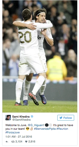 Tiền vệ 29 tuổi người Đức Khedira vừa chuyển đến Juve vào mùa hè năm ngoái, trên phương tiện truyền thông xã hội, trong lúc có những cơn mưa đá đang ném về phía Higuain, đã cho đăng tải hình ảnh bộ đôi khi đang chơi cho “Kền kền trắng” với dòng chú thích