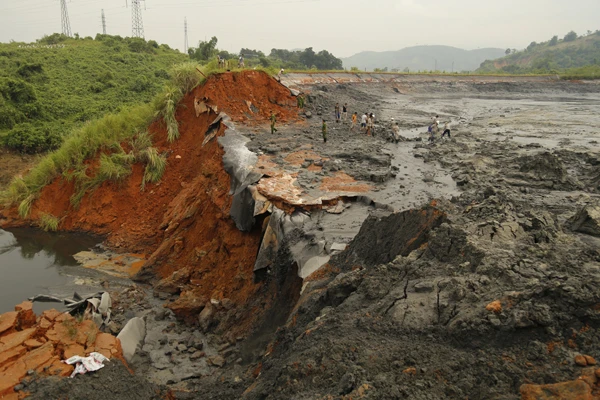 Do mưa lớn kéo dài, nước trong hồ thải dâng cao, hệ thống bờ bao bị vỡ khiến hàng ngàn mét khối nước thải, chất thải chứa chất độc hại chảy tràn ra ngoài. Ảnh: LCO