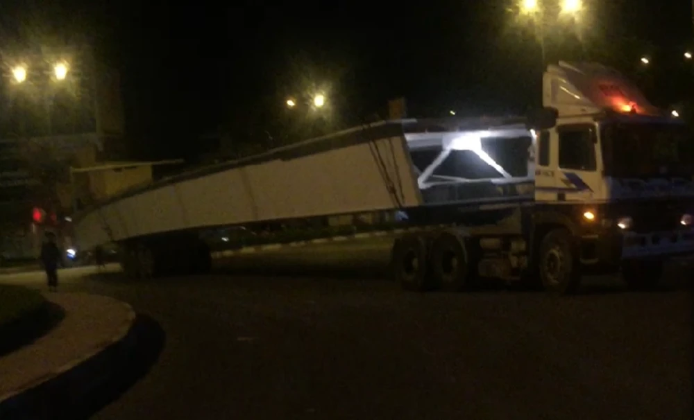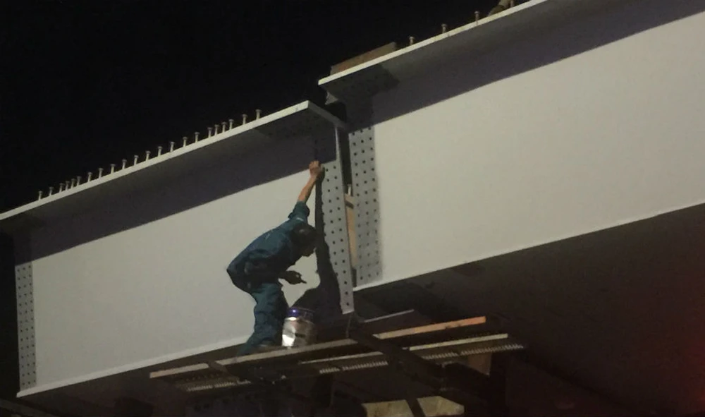 Đúng 3 giờ sáng 22-11, dầm hộp bằng thép dài 45 m, rộng 4-4,5 m có đường lượn cong theo chiều tay phải được đưa từ Biên Hòa về chân công trường. Để chở chiếc dầm hộp siêu trường, siêu trọng, nặng hơn 75 tấn này trên hành trình hơn 20 km phải mất hơn ba tiếng đồng hồ đi xuyên đêm.