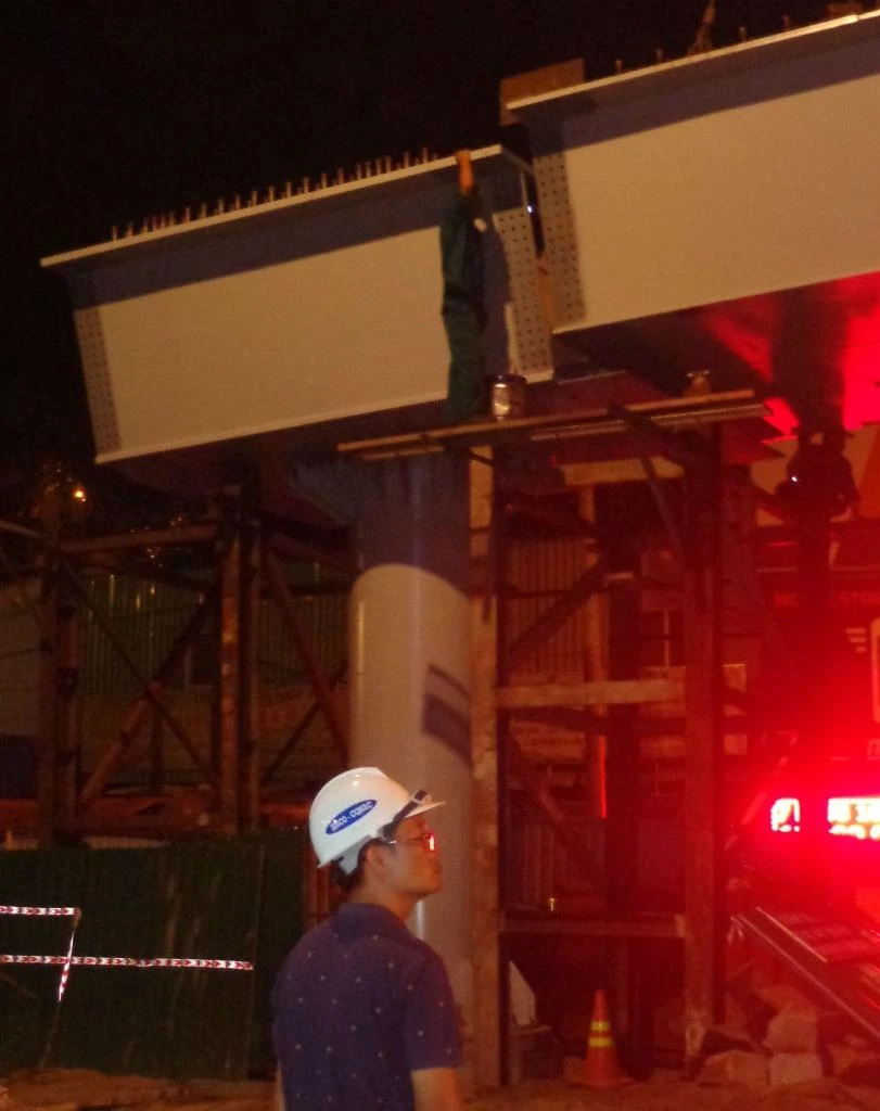 Việc lao lắp dầm hộp được giám sát chặt chẽ bởi kỹ sư trên công trình. Theo kỹ sư trưởng Nguyễn Đức Phương (người đứng dưới đất, đội mũ bảo hộ lao động), ngay sau khi dầm hộp thép được lao lắp xong, những ngày tới sẽ triển khai làm mặt cầu rộng 7,5 m.