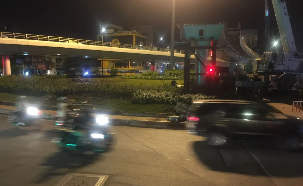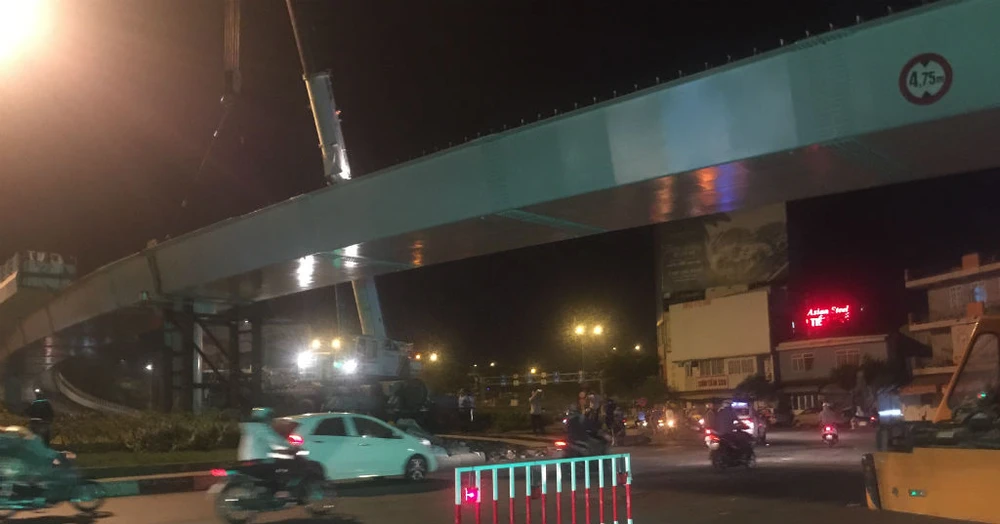 Đến 4 giờ 30 sáng nay (22-11), việc lao dầm hộp đã hoàn thành. Mặt đường bên dưới vòng xoay được trả lại cho lưu thông bình thường.