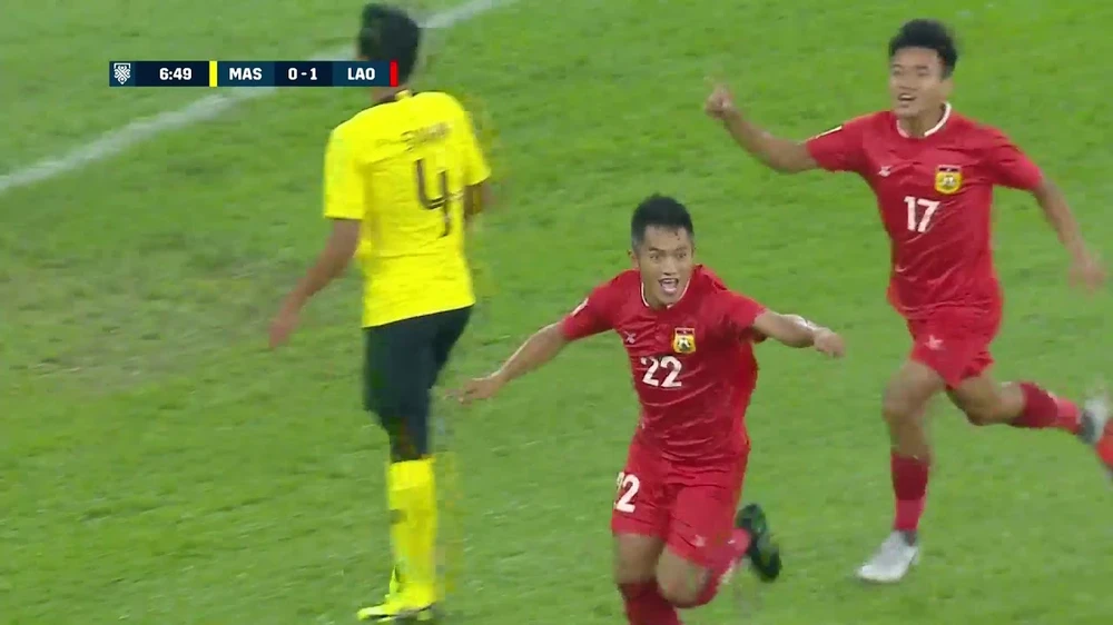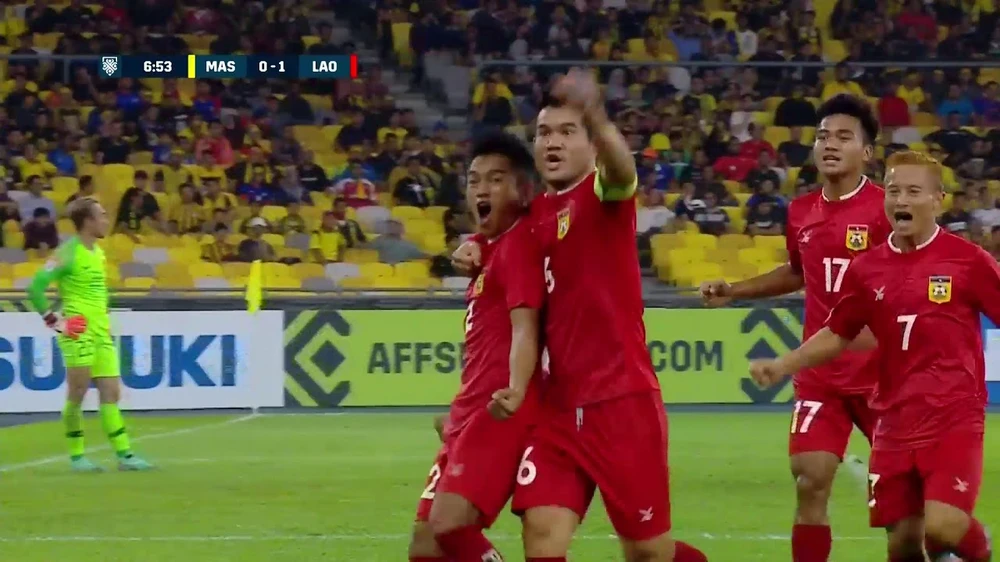 Và tuyển Lào đã gây bất ngờ bằng bàn mở tỉ số. Từ cú sút phạt trực tiếp rất hay của Kongmathilah cách cầu môn chừng 30m về góc trái, cái “que trái” của Kongmathilah quá điệu nghệ đưa bóng căng vào sát góc ê ke làm thủ môn Che Mah Fahmi chỉ kịp với tới bóng chứ không thể đẩy ra ngoài được.