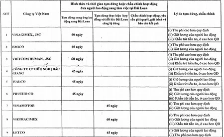 Chín trong số 15 công ty xuất khẩu lao động Việt Nam bị tạm dừng cung ứng lao động, tạm dừng thực hiện hợp đồng và chấn chỉnh hợp đồng đưa lao động sang ài Loan từ ngày 20-2-2014. Nguồn: Cục Quản lý Lao động ngoài nước (Bộ LĐ-TB&XH)
