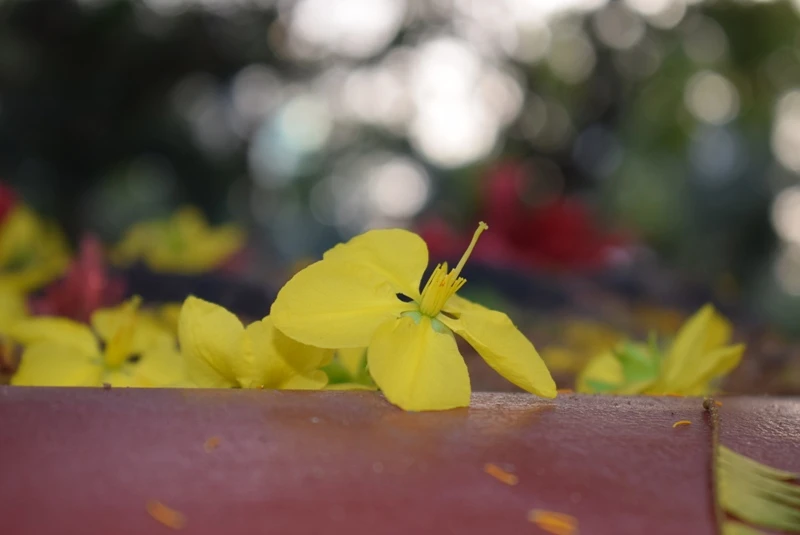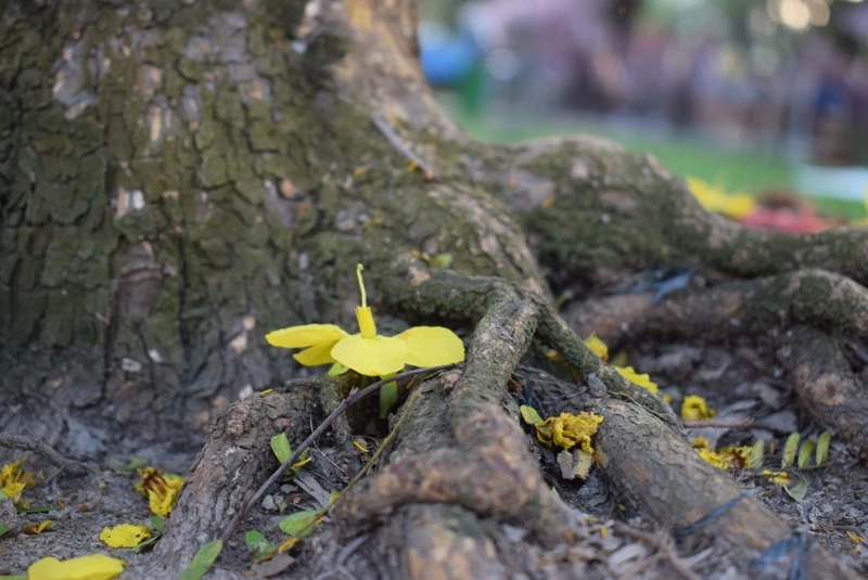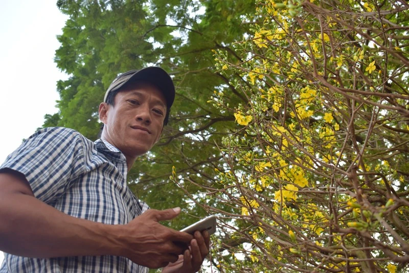 Anh Lê Hoàng Bảo Hiếu (Vĩnh Long), chủ cây, cho biết đây là giống mai hương. “Cây mai mình chuyển từ Vĩnh Long lên hôm 25 Tết. Em thử ngắt một bông hoa ngửi xem, thơm lắm. Cây này đặt trong nhà là thơm cả vùng luôn. Nãy giờ anh ngắt bông, tay còn thơm nè” - anh Hiếu cho biết. Thử nhặt một bông hoa còn nhụy rơi xuống đất, quả thực hoa có mùi thơm thoang thoảng, dịu mát.