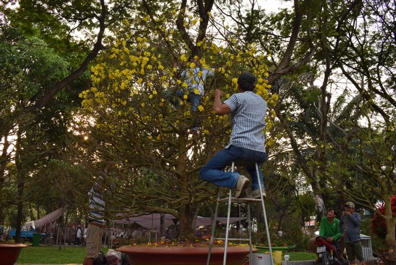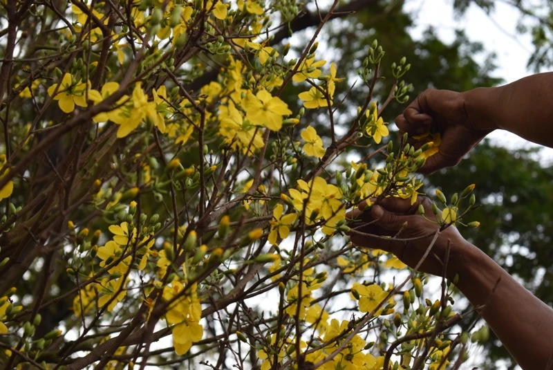 Một người bạn leo lên cây để hái bớt hoa, anh thì bắc thang hái phụ. Anh bảo ngắt bớt hoa để vừa đảm bảo dưỡng chất cho cây vừa giúp người mua nhìn vào còn thấy nụ, chứ không lại tưởng hoa nở sớm hết rồi.