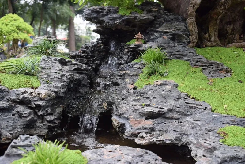 Lão me sừng sững trên chậu gỗ lũa có đôn rồng nâng đỡ với dòng suối róc rách chảy len qua núi đá tạo thêm vẻ nên thơ hữu tình. Tiểu cảnh thu hút rất nhiều người tới chiêm ngưỡng.